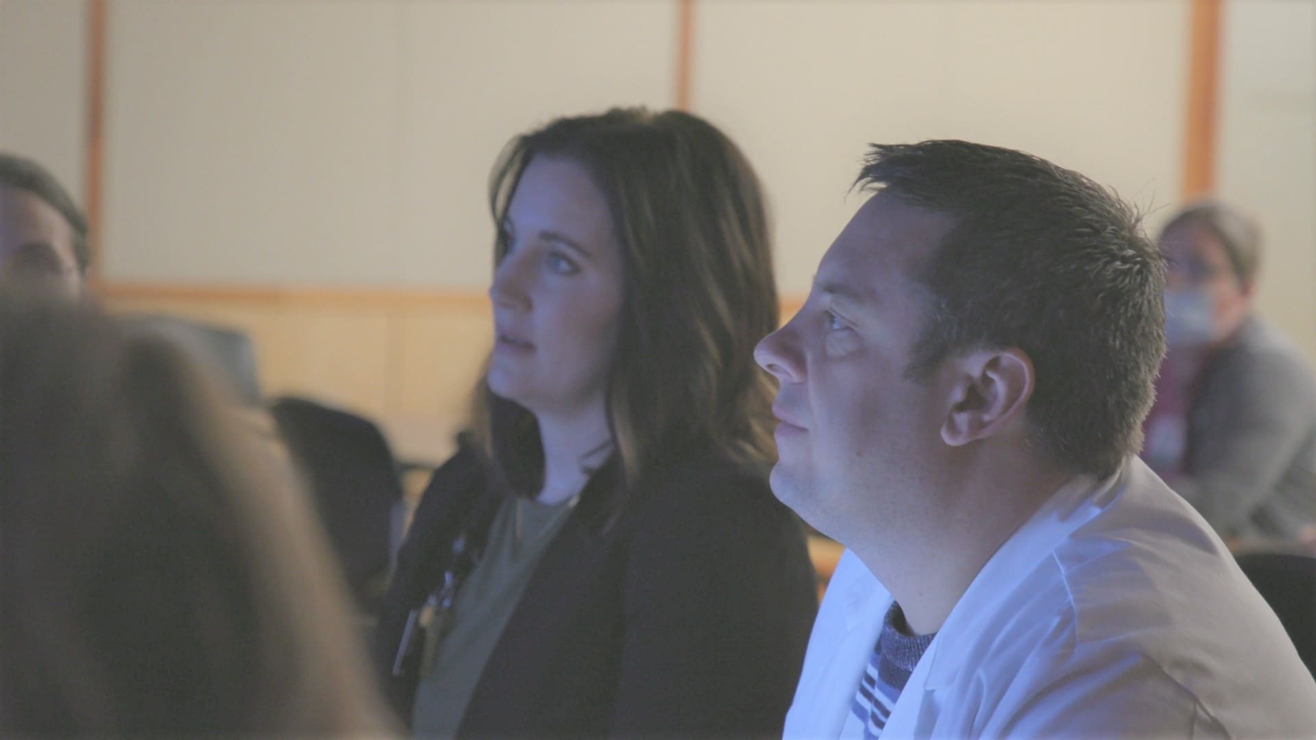 Breast cancer specialists Allie Higgins, MD, and Jason Jones, MD, listen to patient cases presented at breast cancer tumor-specific conferences.