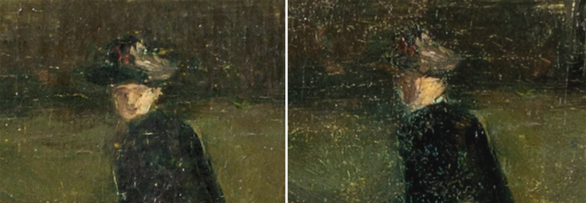 The painting was restored before being re-exhibited this week. Two very small areas of loss at the bottom of the photo that were damaged during the theft have been filled in and retouched. The old discolored varnish was removed, brightening the painting.
