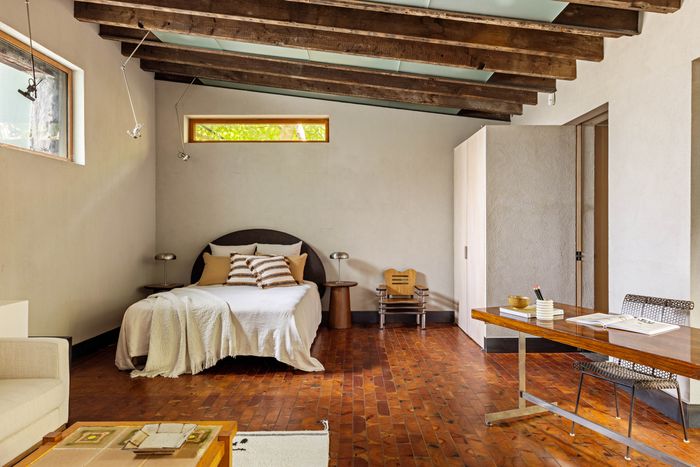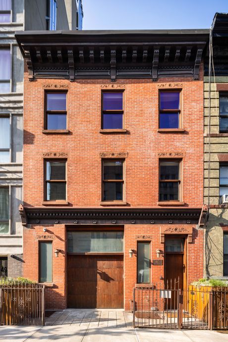 The main house and back garden have extensive gardens, and the grounds are 131 feet deep. To spruce up the landscaping, they dug up an entire Belgian block and repurposed it as a patio, and built a deck out of sequoia wood ripped from an old water tower. Other wood they brought in was salvaged and given a kind of patina. The beams left exposed in the ceiling and the treads on the floating staircase are yellow pine salvaged from a demolished Brooklyn warehouse. The floorboards were carved from walnut trees felled at a construction site in North Carolina. Rosewood salvaged from the old Concord Hotel in the Catskill Mountains became the paneling in the master bedroom. (Faber liked to imagine Frank Sinatra, a regular at Concord, dancing behind his head.) Even the fixtures, like the industrial lamps from the prison, are recycled and are “very durable,” Niemegius Faber said.