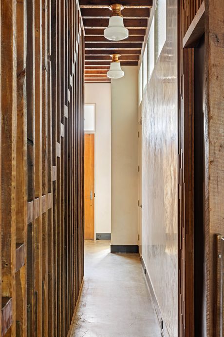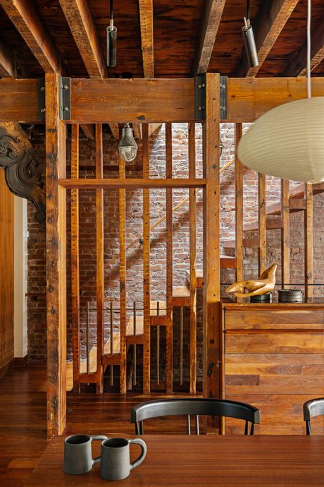According to its appearance on old maps, the three-story carriage house was built in the mid-1800s, with Belgian blockstone peeking out from the dirt behind what looked like an old stable. But the main house had been divided into four rental homes equipped with cheap materials and a bleak carpeted staircase. The couple hired 12 workers to get the complete guts and tried to spend most of their budget on labor by harvesting all the scraps pulled out during demolition. Rust-colored Douglas fir boards appear on the partition walls, creating a Japanese-style screen that highlights the floating staircase. Scraps were put together to create a new front door, garage door and “the most amazing flooring I’ve ever built,” Faber said. He mentioned the end-cap floor at the back of a former stable that had been converted into an office.