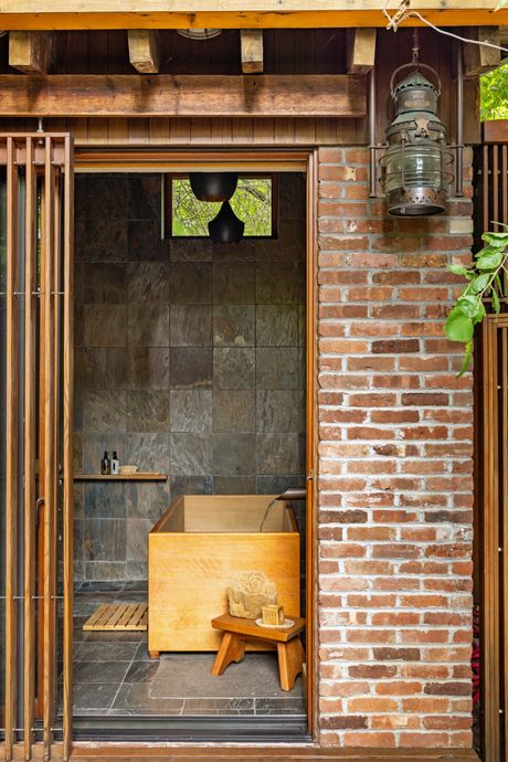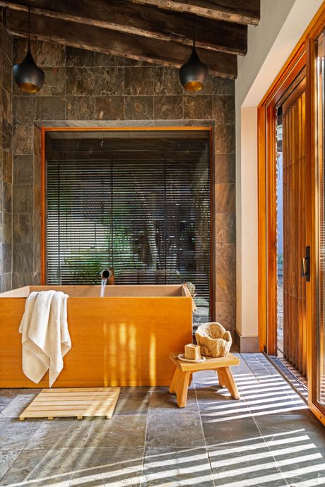 The guesthouse has a steam room and deep cypress bathtub. Slide the slats closed for privacy. From the top: Photo: Hayley Ellen Day/CorcoranPhoto: Hayley Ellen Day/Corcoran