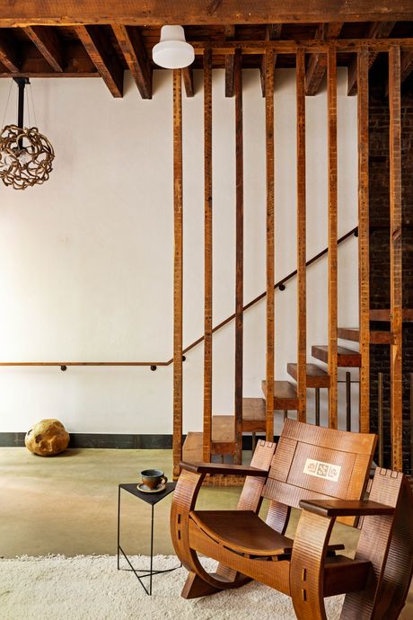 The walnut flooring was made from trees felled on-site in North Carolina. The wood with carved scrolls comes from Chinese temples and decorates the supporting beams.