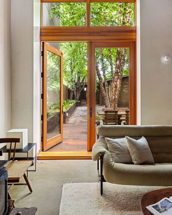 Windows were replaced to let in more light and ease access from the den to the deck, and were made from redwood reclaimed from the water tower. Colin Faber and Leni Niemegeers-Faber / Hayley Ellen Day for Corcoran.