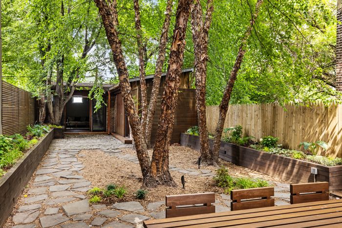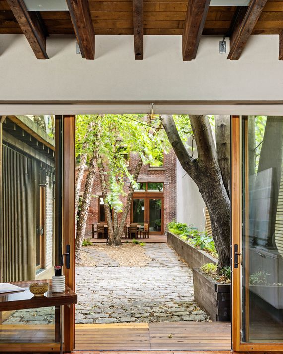 The family study door opens into the garden, where Belgian blocks and bluestone dug out of the earth were repurposed to create a patio and path. Corcoran’s Hayley Ellen Day.