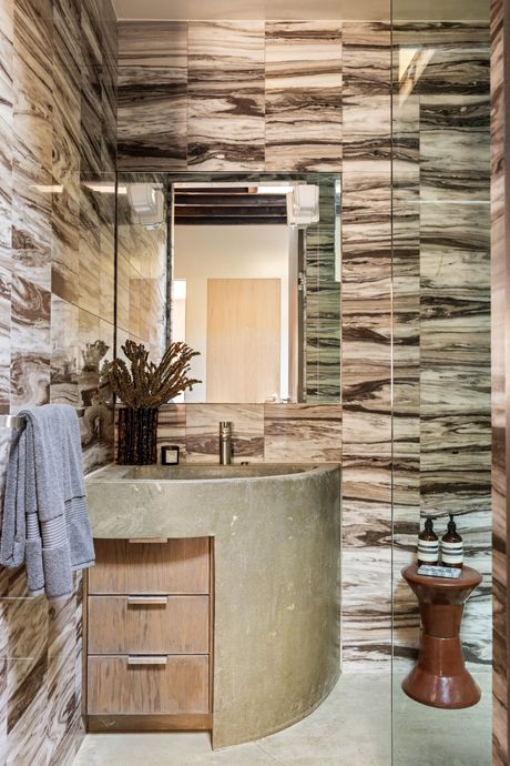 “Our home became a model home of sorts, where we could walk potential customers through and see what materials they were drawn to,” Faber said. It helped that every corner of the place was a little different. While the downstairs is Venetian stucco, the upper level has many custom details, including a two-tone lime wash, three-shaped cast concrete sink, and a shower with a drain hidden beneath the tile grout line that started the trend. “We had to use it several times after that,” Niemegius Farber said. Contemporary metal windows were removed in favor of wide glass panes framed in wood, and skylights above the stairs were enlarged, showing how to bring more light into the sometimes dark townhomes used to reimagine them.