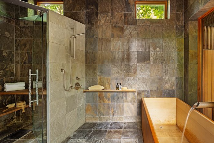 The guesthouse has a steam room and deep cypress bathtub. Slide the slats closed for privacy. From left: Photo: Hayley Ellen Day/CorcoranPhoto: Hayley Ellen Day/Corcoran