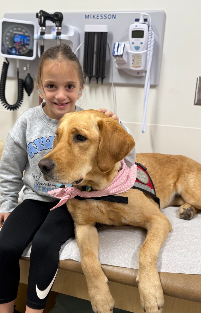 When Ollie goes for checkups at a hospital in Charlotte, North Carolina, he is sometimes visited by a therapy dog named Sage. (Brittany Super)